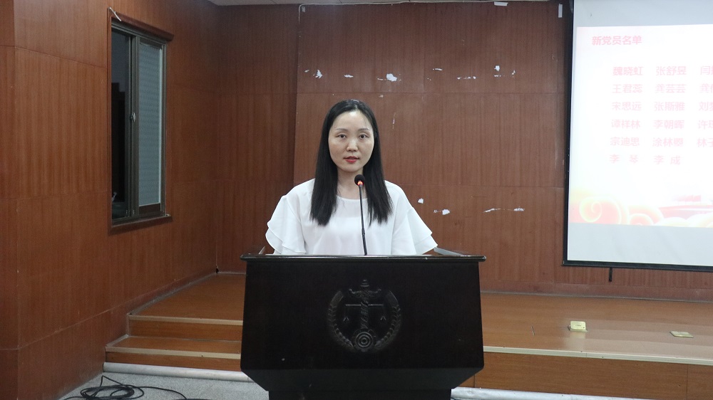 新发展党员名单,全体新发展党员在学生党总支委员刘璇子同志的带领下面向党旗庄严宣誓。宣誓后,本科生2014、2016级联合党支部的魏晓虹作为新发展党员代表进行了发言。“爱国、励志、求真、力行”,她在发言中引用习近平总书记在北京大学师生座谈会上的讲话,激励新时代青年要担当社会主义建设者和接班人的使命,并表示会更加高标准地要求自己,积极发挥学生党员的模范带头作用。