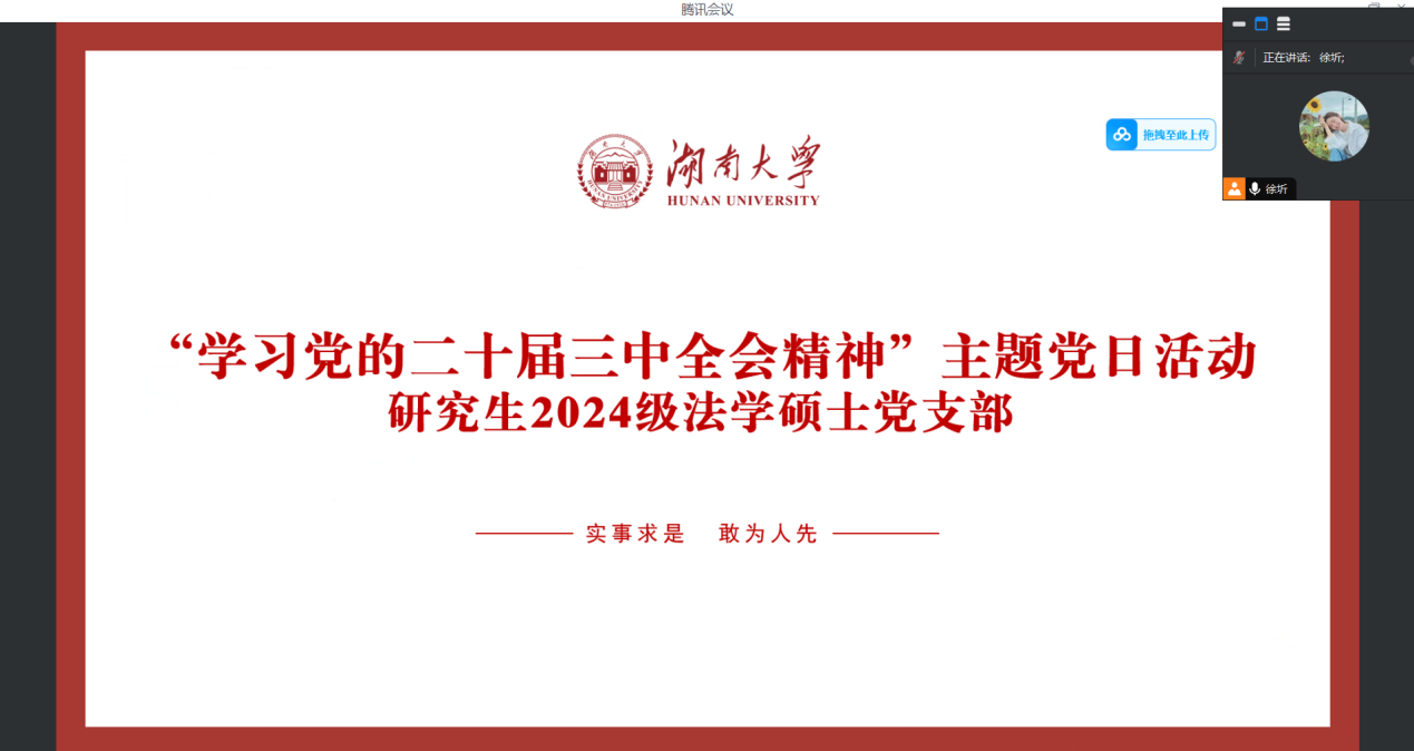 研究生2024级法学硕士党支部于9月22日通过线上会议的形式,开展了“学习党的二十届三中全会精神”主题党日活动。活动由党支部书记徐圻主持,支部全体党员同志参加。