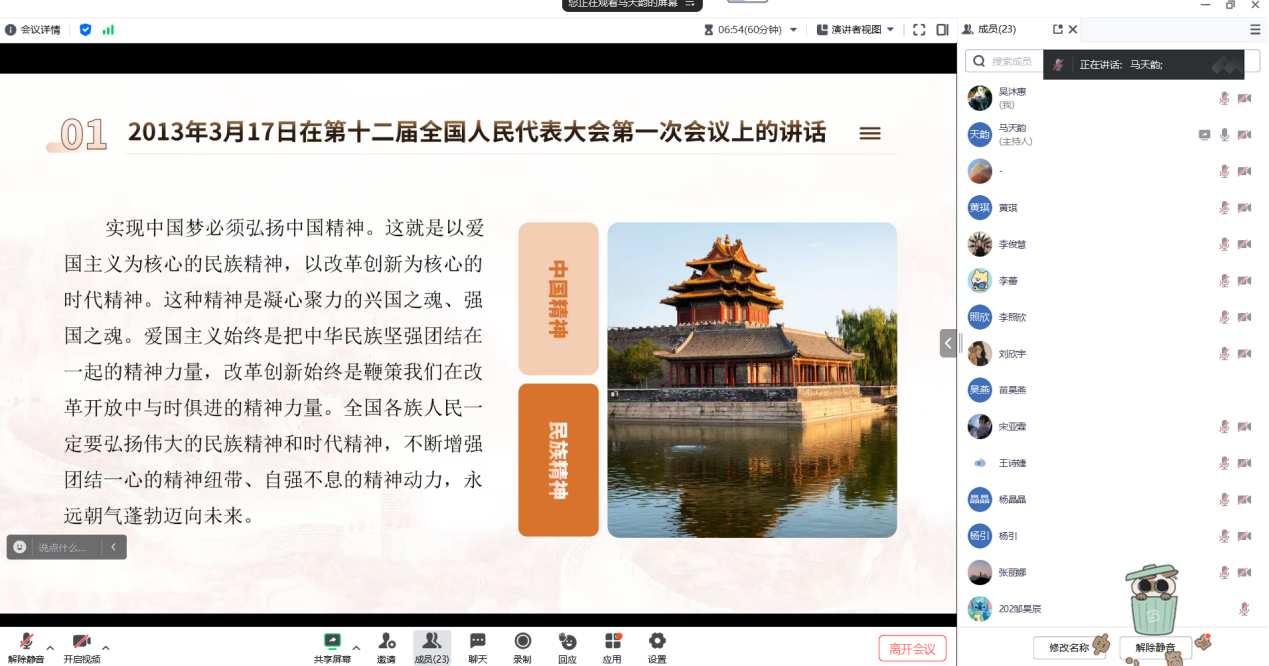 为深入学习习近平总书记关于弘扬伟大爱国主义精神的重要论述,研究生2024级法律硕士(非法学)党支部于2024年10月21日通过线上会议的形式,举行了“学习习近平总书记关于大力弘扬伟大爱国主义精神的重要论述”主题党日活动,全体党员围绕《大力弘扬伟大爱国主义精神,把强国建设、民族复兴伟业不断推向前进》展开深入研讨和交流。会议旨在引导学生党员深刻理解和领会爱国主义的时代价值,增强爱国情怀,提升责任感和使命感。支部全体党员参加本次活动,活动由党支部书记马天韵主持。